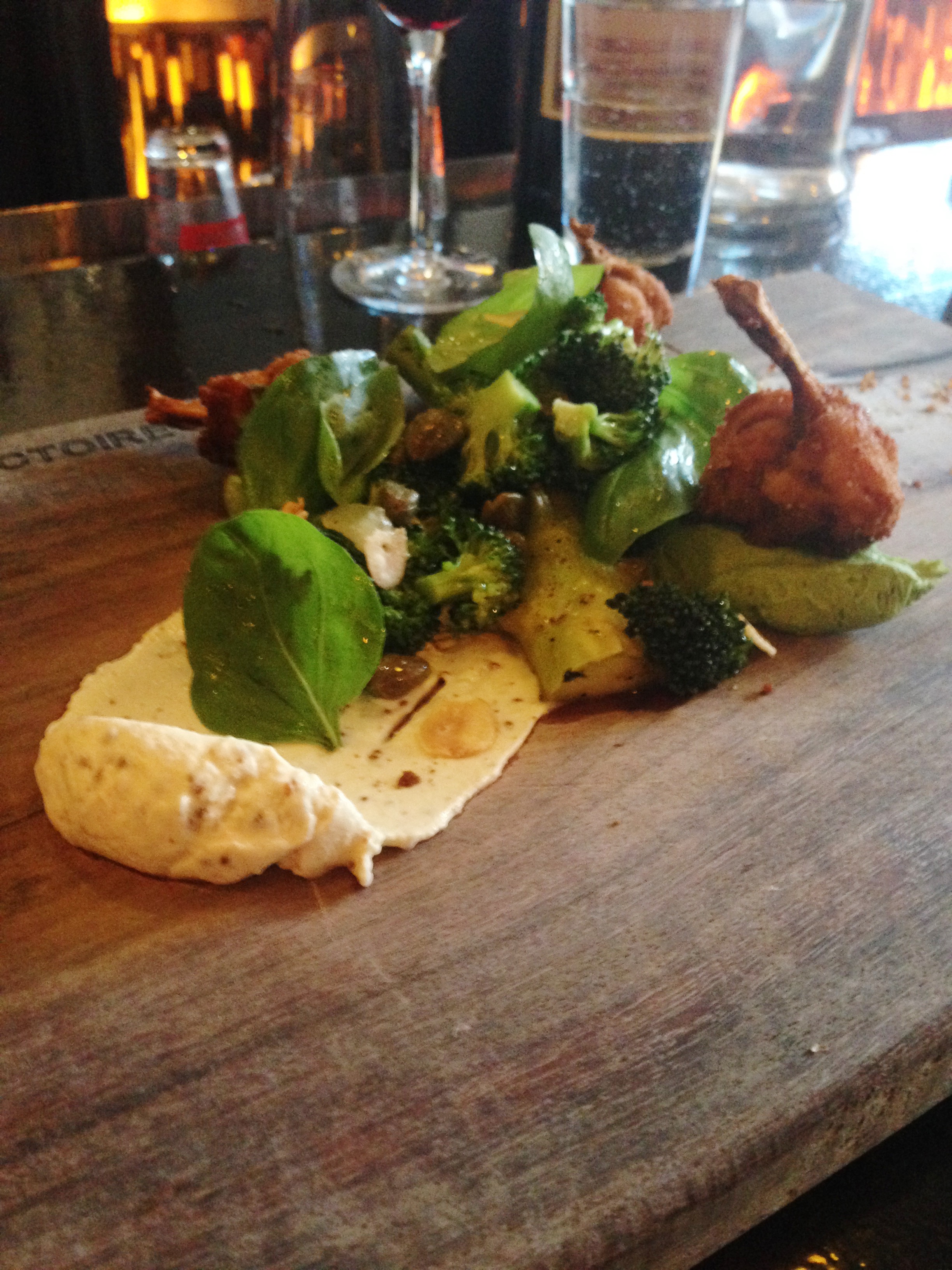 I had heard off the establishment before and actually had passed in front the week before and was pleasantly surprised by the decor so we decided to give it a try. I got there first and picked a spot at the bar as when you’re on a schedule I always find it easier to get the waiters attention if you need anything. I settled down and started to look at the menu while having a Trou du Diable which is a local craft beer. After my friend showed up we ordered wine(by the way they have a wide selection) and let the waiter walk us through the menu. As his description of each dish was done it was clear at this point that it would be very hard to make a choice as every dish sounded better than the other.