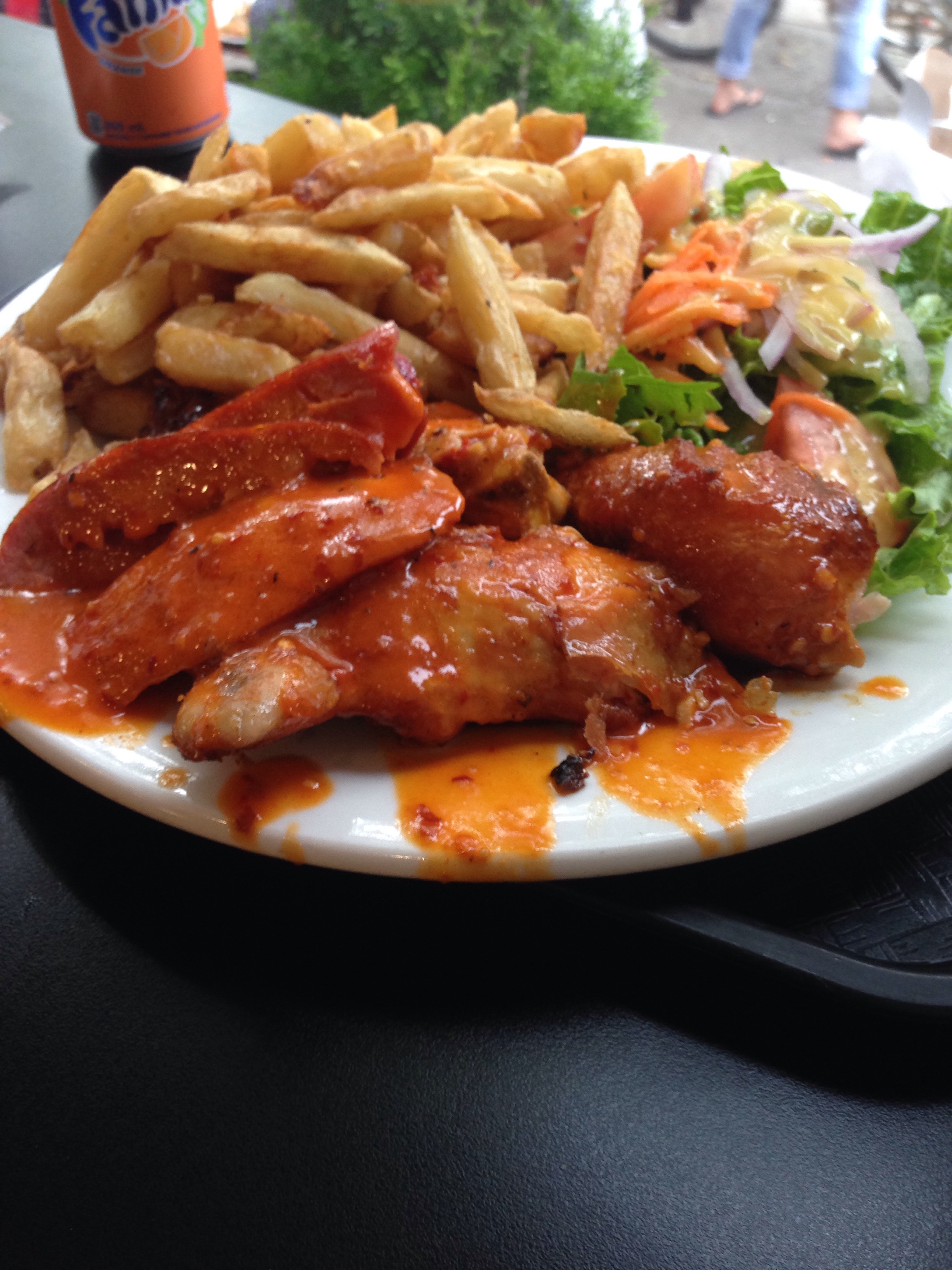 I was walking along Rachel Street when I spotted a line up in front of this restaurant. Since it’s right in front of La Banquise I thought maybe people didn’t want to wait and this place was getting the overflow from across the street. I stopped and checked out the menu and decided to give it a try. I can confirm that Ma Poule Mouillée is not busy just because of other popular spots in the neighborhood. This restaurant is a Portuguese rotisserie and offers chicken, chorizo, and sandwiches. The food is really good and rather inexpensive, I had a chicken leg and chorizo which is served with salad and fries and I honestly could not finish my plate. If you are planning to do activities in Lafontaine Park, with the price of their food I`m not event sure it would be worth bringing a picnic as they are only a couple of minutes away. There are obviously quite a few good Portuguese Rotisserie restaurants in the city but this one just made in my top places. I`ve put the menu below so you can have a better idea of what they offer and also of their pricing.