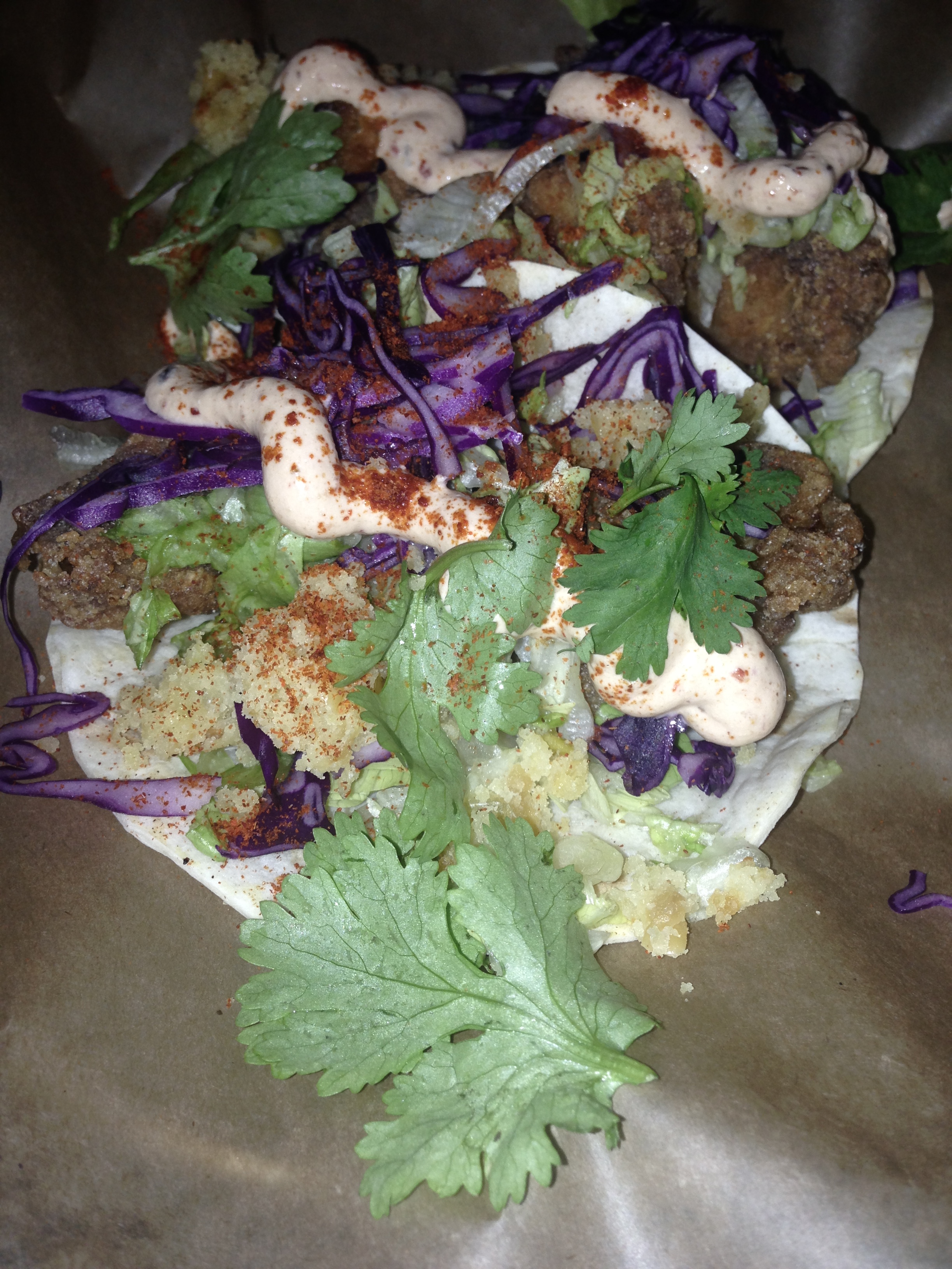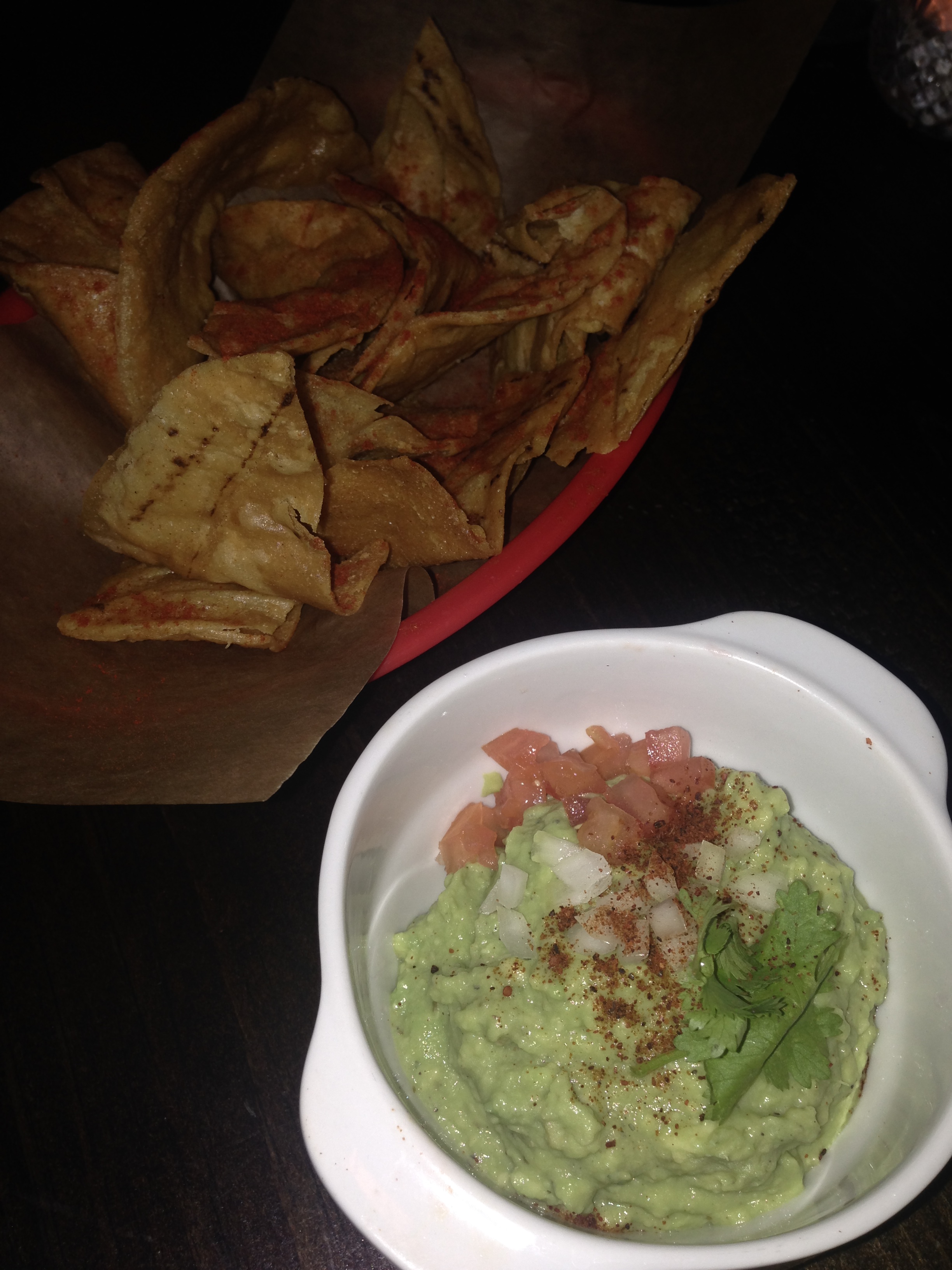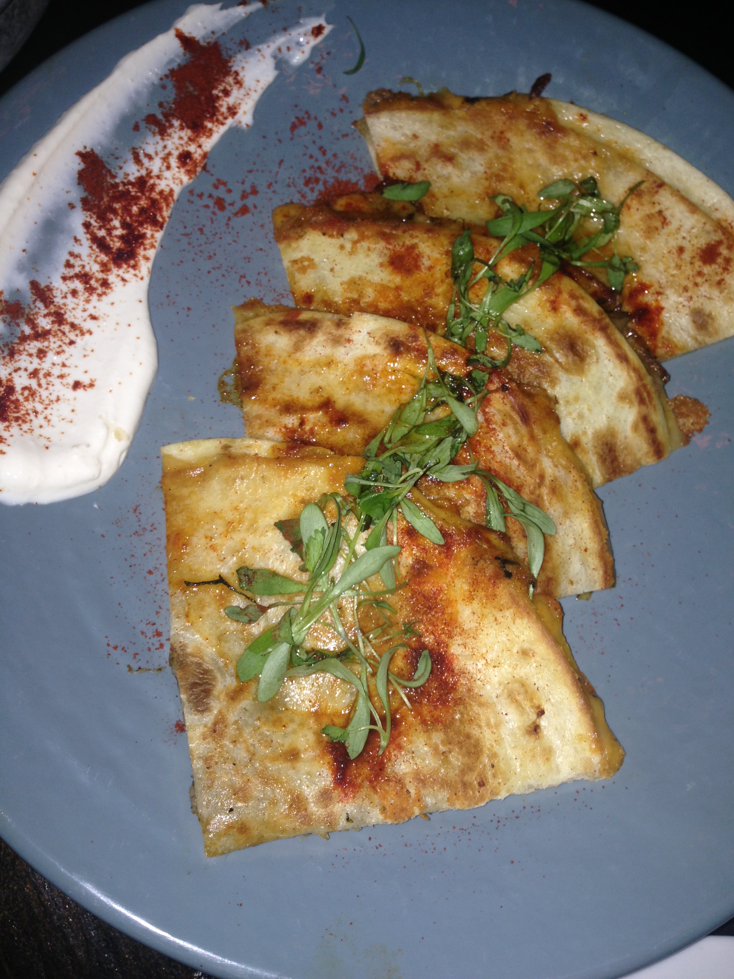 We started with Guacamole and some Quesadilla Sincronizada de Hongos. Guacamole was very good and served with Morita tortilla chips that are like deep fried tortillas. The Quesadilla made with sauted mushrooms,Oaxaca cheese, aged cheddar and black truffle paste were also excellent, the truffle paste giving it an interesting taste without over powering the other flavors. We completed our meal with some Pollos Hermanos tacos made with deep fried chicken, Chipotle crema corn bread croutons and iceberg lettuce. We finished up the meal with an aged Mezcal Reposado, if you’re not familiar with Mezcal this one tastes more like a fine Scotch and had an hint of smokiness and has nothing to do with the one with the worm that you might have enjoyed on a spring break trip to Mexico. This is a great place if you want to have a good time with friends and prices are very reasonable. I strongly suggest a reservations by phone or Bookenda app as there was no room on my second tentative visit.
