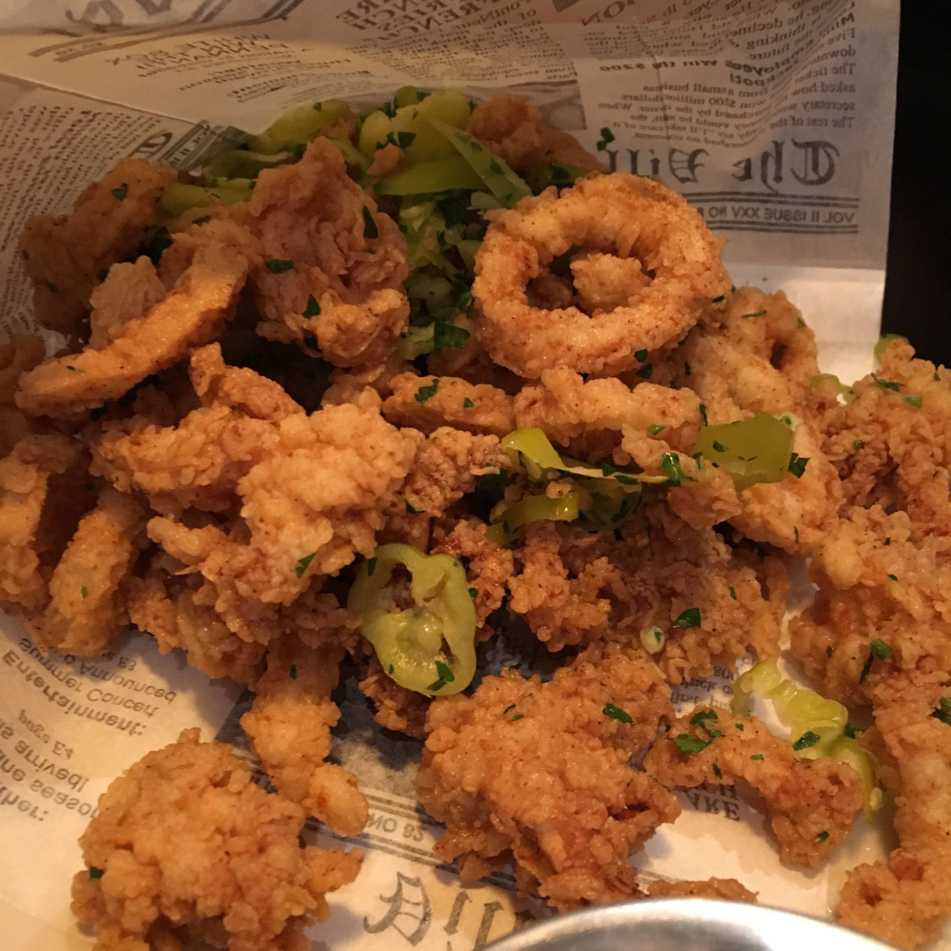 First there is no long menu here, you’ll find everything you would like to order on your place mat. While we were looking I ordered some fried calamari. They were actually very good and I liked the twist they put on it by serving it with hot peppers in a sort of newspaper the same way you would be served fish and chip in England.
