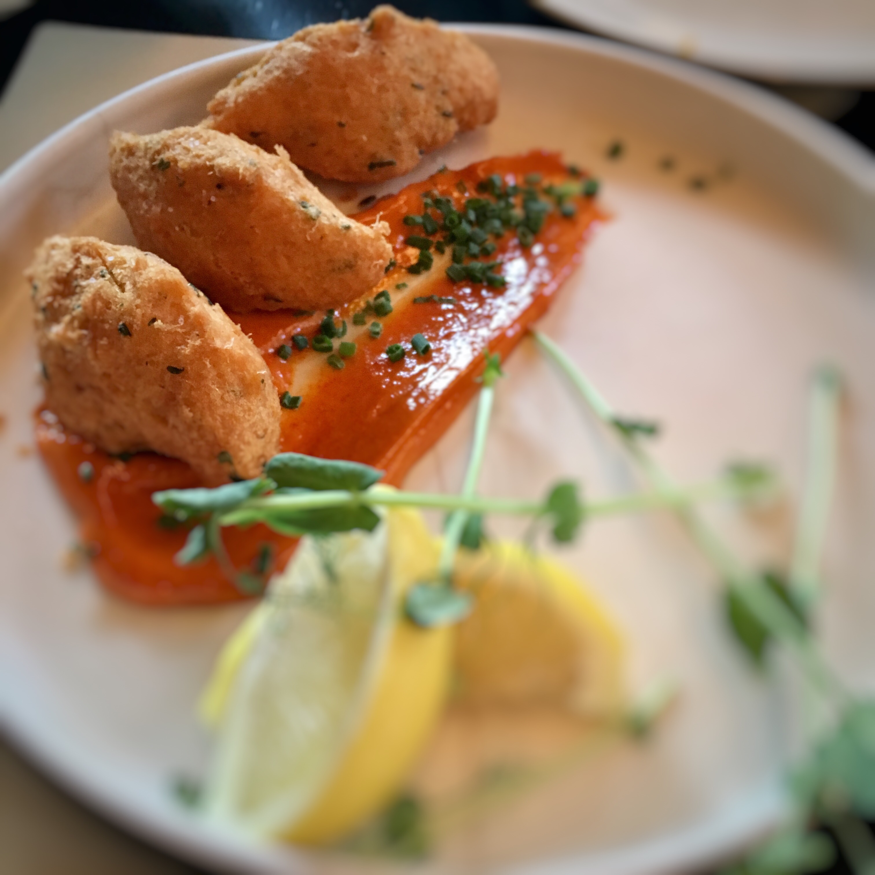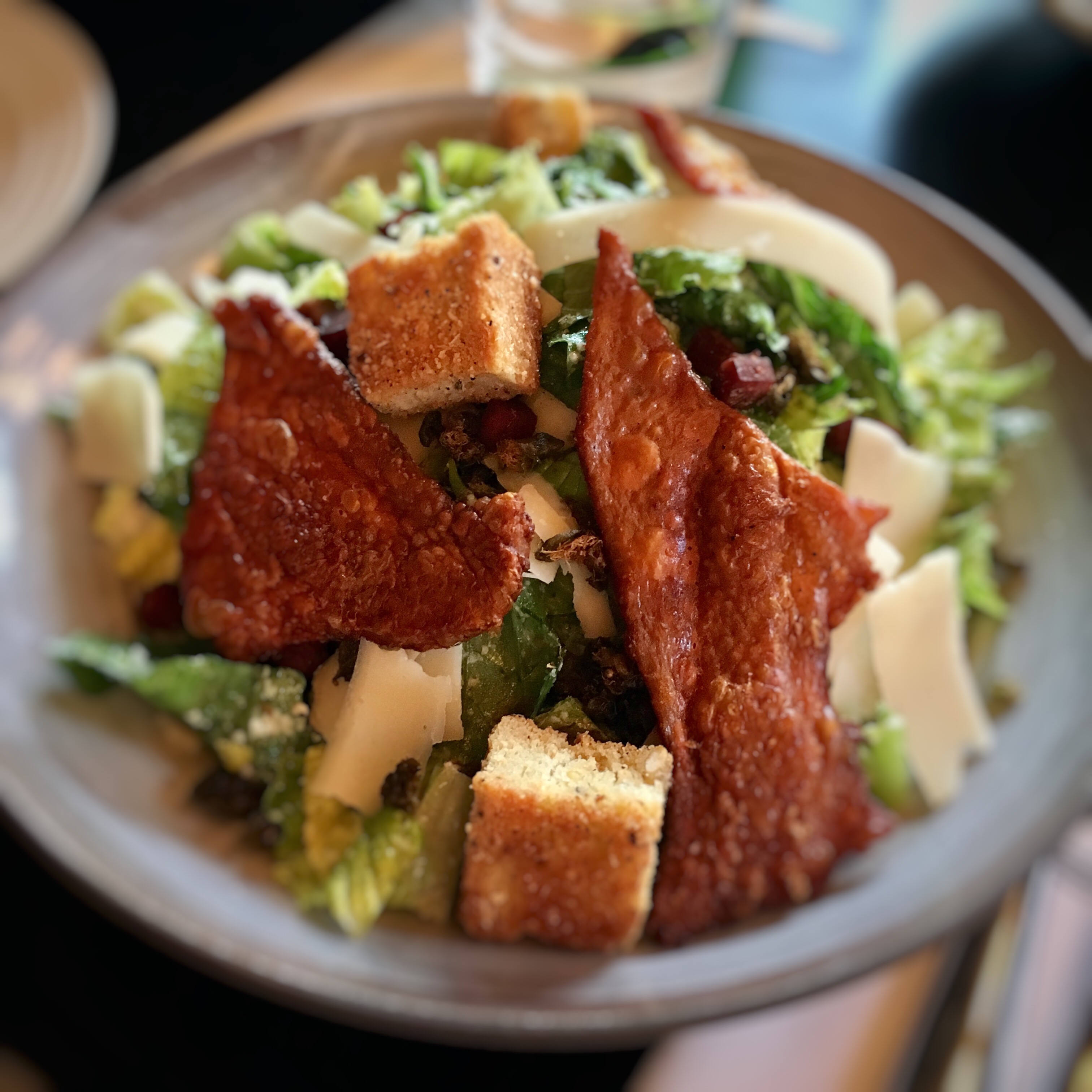 We decided to start with sharing some appetizers to get to try more of their dishes. They have quite a few choices on the menu but we all agreed on , the popcorn chicken, the Bird Bar Poutine, the cod croquettes and the fried chicken skin Caesar salad that was not on the menu.