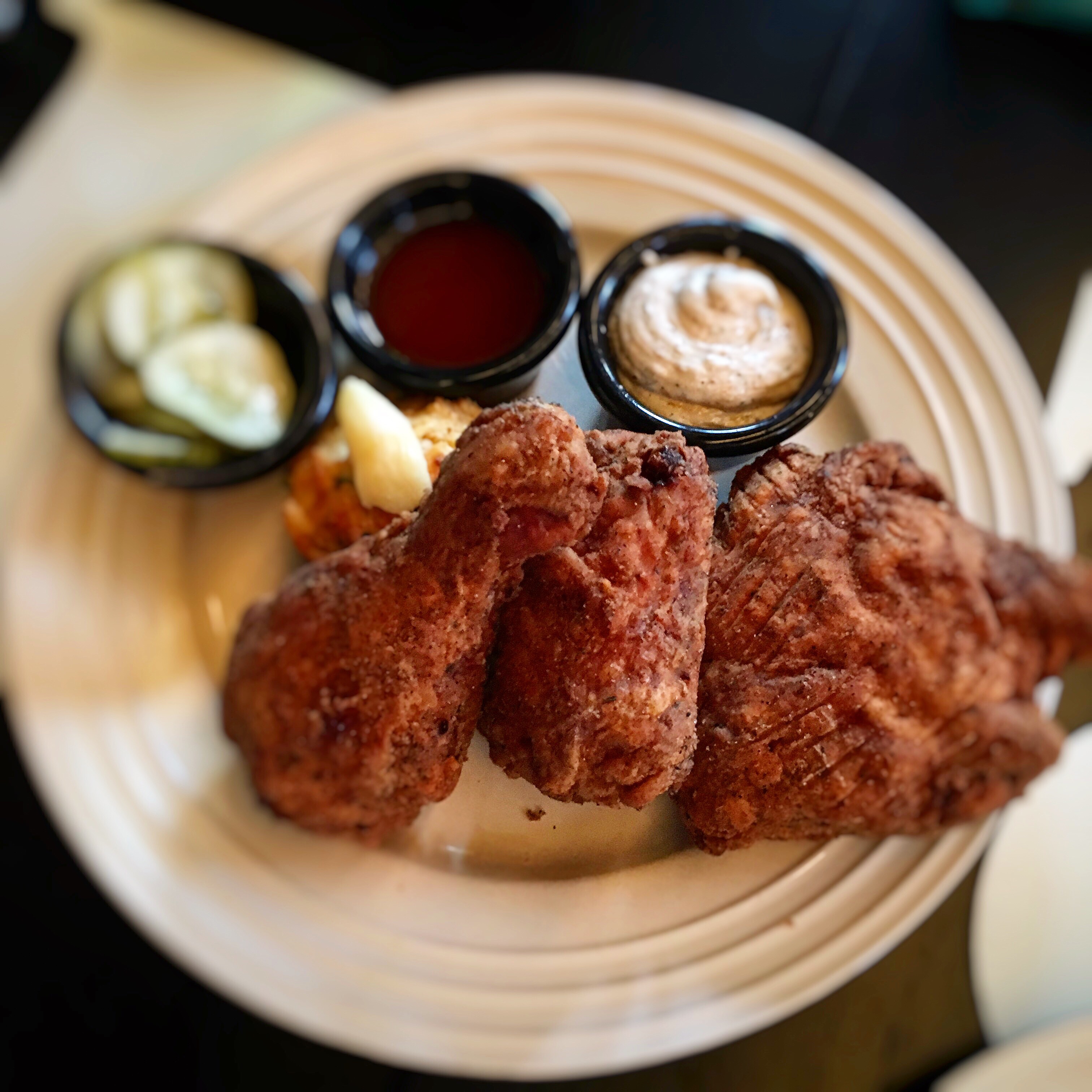 If you’re the type to eat the skin first off your chicken and if it’s available you’ll love the Caesar. That crispy chicken skin with large croutons and big Parmesan shaving was actually very good, I was skeptical on ordering salad but that was a good choice. The popcorn chicken served in sweet chili sauce was also good, I really like that fact that they were perfect bite size. I also like the cod croquettes served with smokey citrus mayo but I have to admit that my favorite was the Bird Bar Poutine. Nice pieces of chicken and the sauce really taste like it was made with a chicken broth base instead of the regular brown sauce. We obviously needed to try the fried chicken so we ordered the ” Get In Ma Belly” a 3 pieces of fried chicken dish.