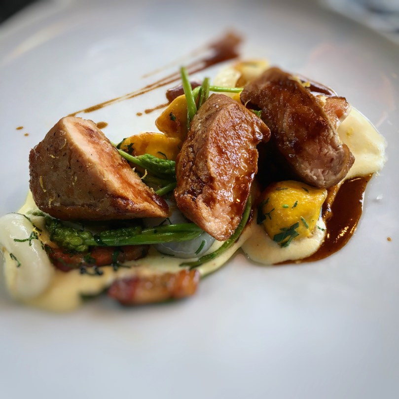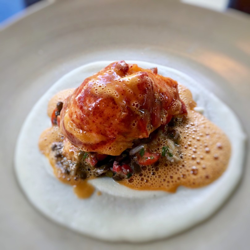 I started with an appetizer of lobster served poched with a bisque butter, stew of Du Puy lentils, cherry tomatoes and turnip mousse. This dish was awesome, the tastes all married well together and the lobster since in season was fresh and tasteful. I then had the wild boar served with a creamy polenta, cipolinis, wild asperagus, lard and a black garlic sauce. Again everything came together nicely and was not too heavy. The wild boar was cooked to perfection and was extremely tender.