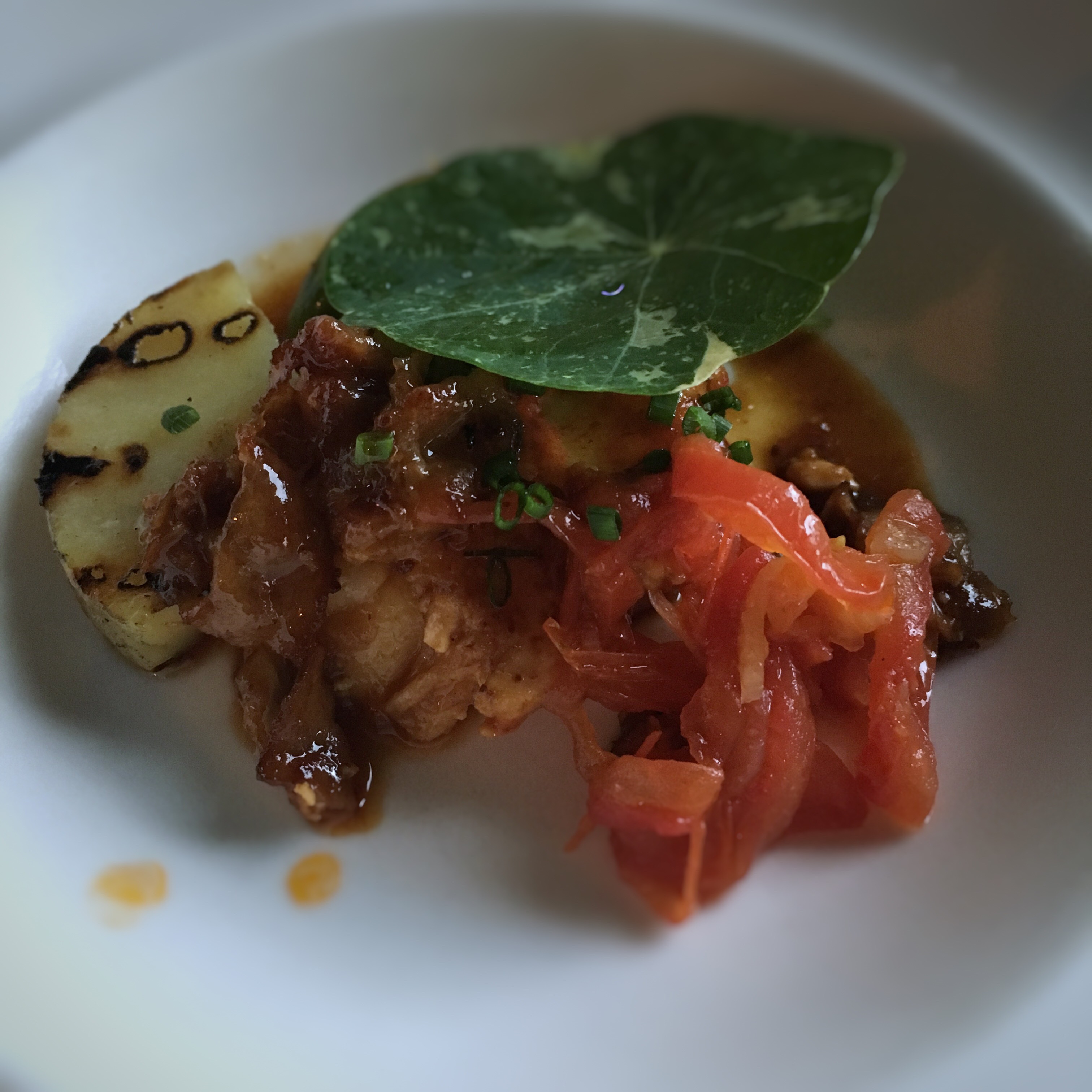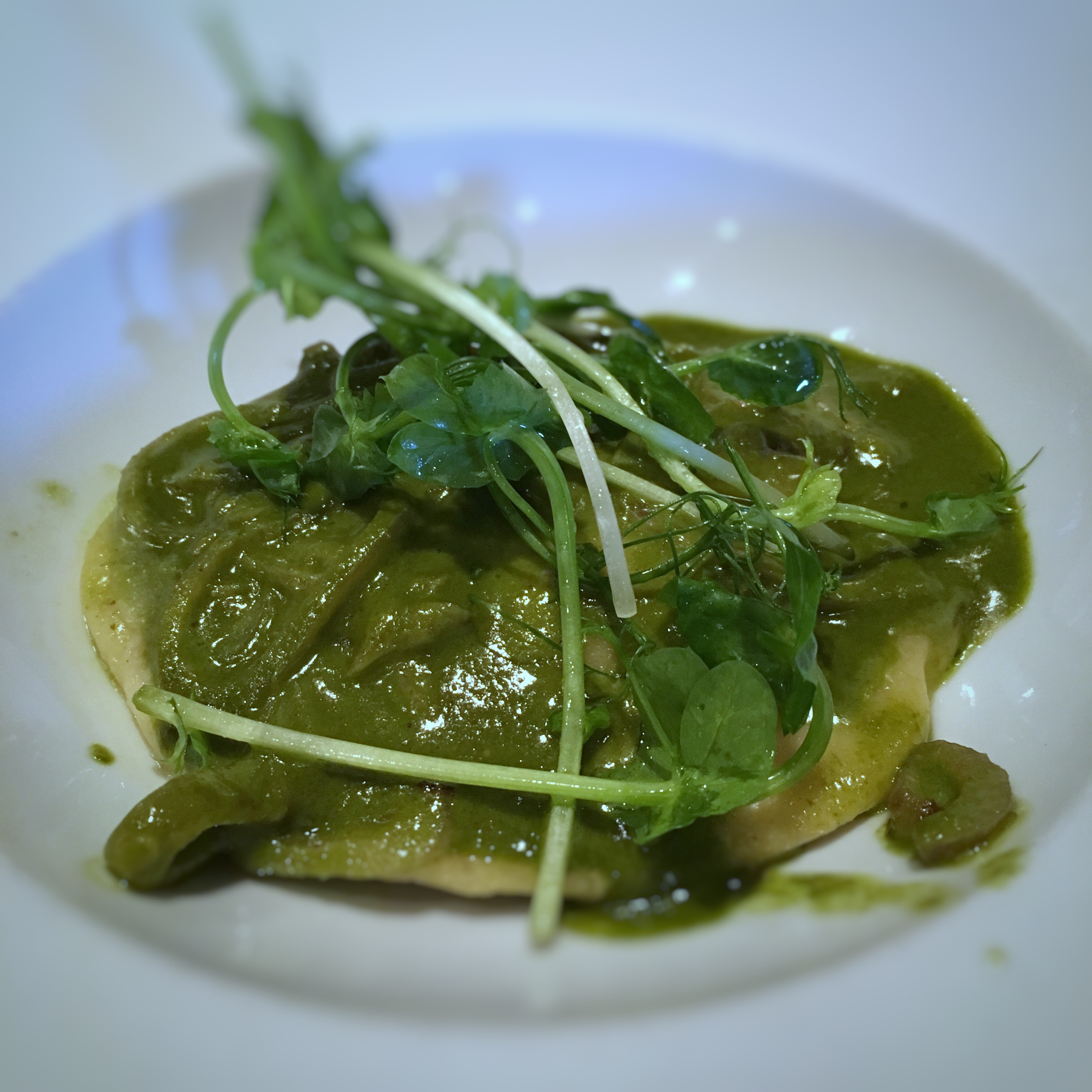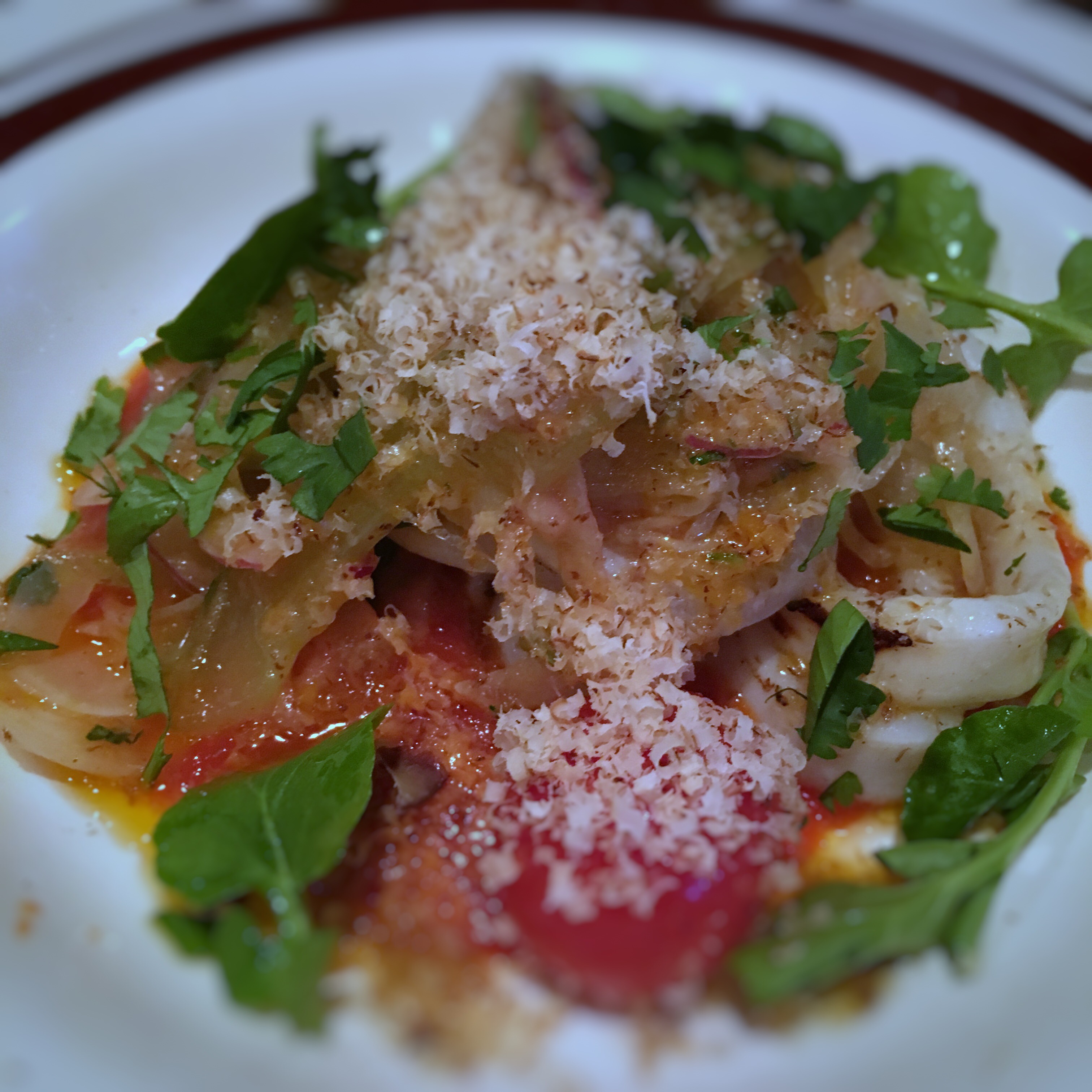 Since we were three we could go a little crazier and order several appetizers. We started with a Tuna tataki, grilled calamari and some oysters. The oysters were very good, a little warmed up with a citrus jelly and topped with radish. The Tuna tataki was also very good seared perfectly on the outside and raw in the center. The grilled calamari was a full grilled piece of calamari and was very tender. It was served with a grilled and spiced red pepper puree, a confit of tomato and fennel and fresh coriander. Since they wanted us to try their Lobster they were kind enough to bring us each a taster and it was good. Poached in butter with white balsamic potatoes, tomatoes and bacon, lobster and bacon who could ask for more. We also had the ravioli and that dish was so tasteful I could have ordered more and make a meal out of it. We finished off our meal with some charcuterie and foie gras (that was to replace dessert) and both were awesome.