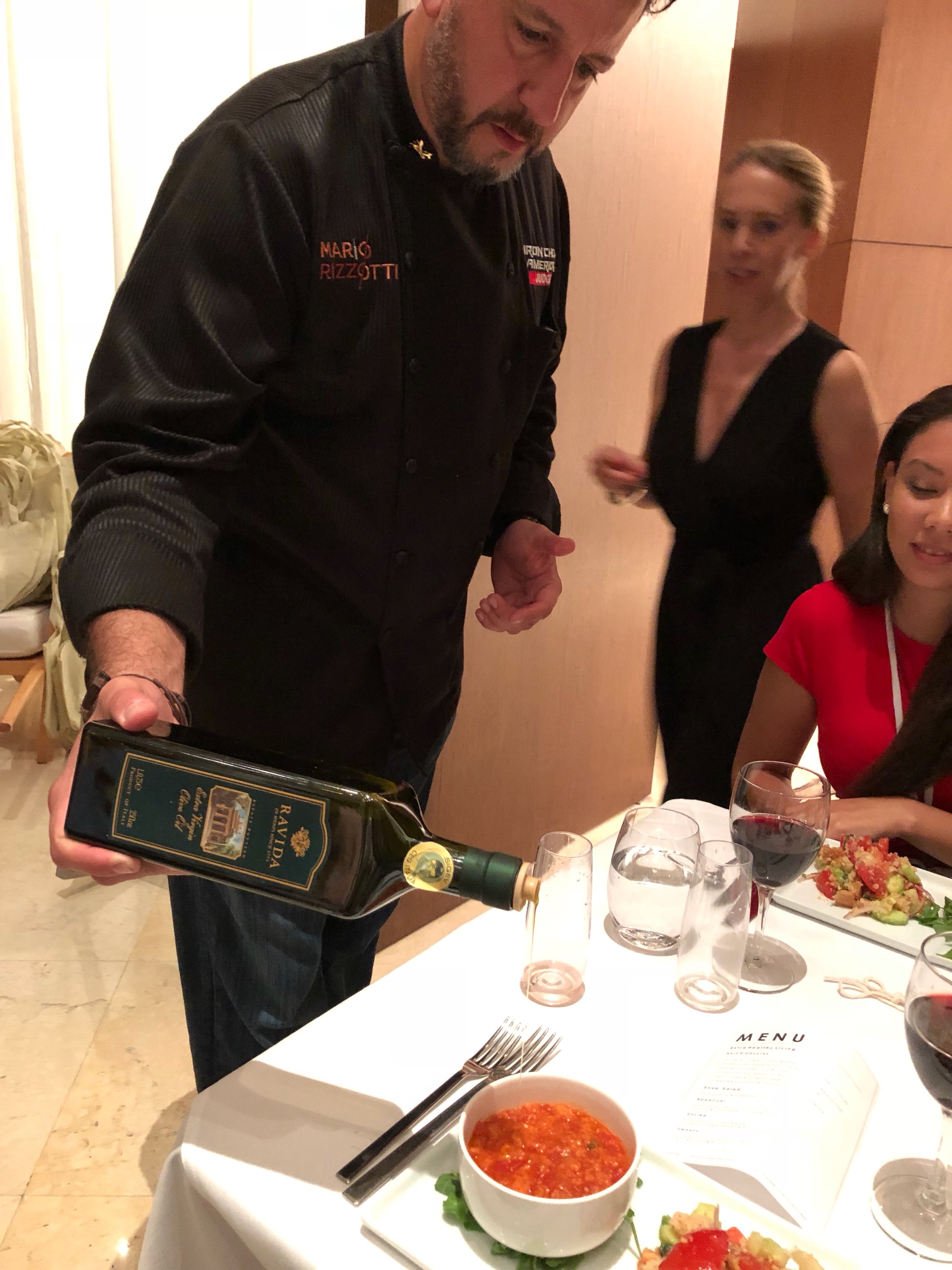 When arriving, I noticed how organized the event was as we were greeted with badges with our names on them and escorted to the elevators. Once we arrived on the 6th floor, we also noticed how beautiful the venue was and how appetizing the hors d’oeuvres looked. We could try different olive oils and even got a very informative (and funny) demonstration by Chefu Mario Rizzotti (a judge on the show “Iron Chef America”) on how to properly taste and determine the quality of extra virgin olive oil. A few things I learned: