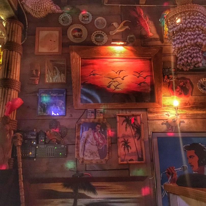 What to say about the décor… eclectic with a shark on the wall next to an Elvis painting next to a blow fish that`s next to a shell decoration. You get the picture of what this place looks like but all that been said the place is pretty cool. They also have banquettes that are separated by wooden separators and obviously a nice long bar.