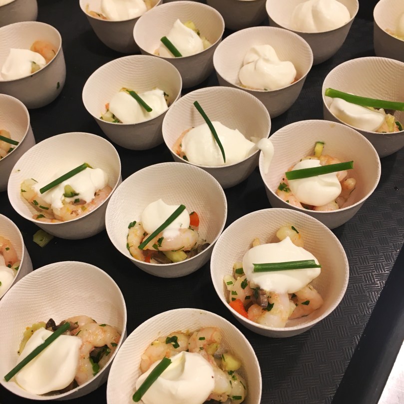 After a few more tips from the chef while enjoying a beer each team were given their main ingredient. One team got Confit de Canard another Shrimps and the third smoked salmon. I was in the second team and after a quick group meeting we got to work. Now it might sound easy cooking as a group respecting the guidelines but it is not that easy. Different ideas bounced off each other but we had 20 minutes to submit our dish. As we were preparing Chef Garnier was preparing us filet mignon on the grill with a nice pieces of smoked salmon filet.