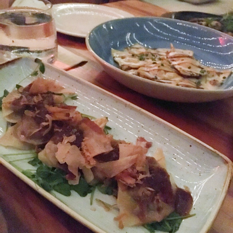 To start off we had the King Crab tempura, Tuna Tataki, Hamachi Tuna. The King Crab tempura was very good, I like crab just as is but the light batter kept the taste of the crab present. Both the Tataki and Hamchi were very fresh and tasty. We then had some Aushak Dumplings filled with a mix of leek, shives and veal ragu. The black truffle, parmesan, gorgonzola and pear Ravioli were also very good.