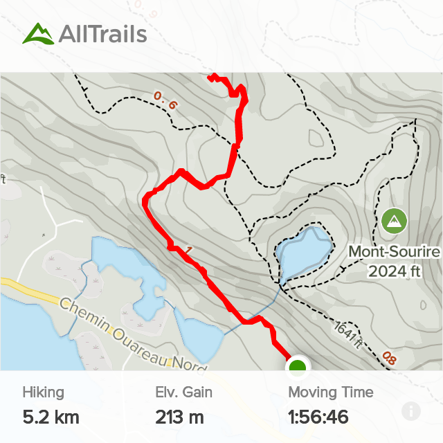 This is a 5.2 km hike with 213 m of elevation gain located near in St-Donat. The drive from Montreal is about 1h50 min. There is no cost of entry and this is an in and out trail.