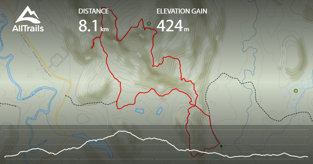 This is a 8.1 km loop hike with 424 m of elevation gain located in the Mont Tremblant National Park. The drive from Montreal is about 1 hour 30 minutes. The cost is 8.75$ if you don’t have a SEPAQ Anual Card. To reach the entrance to this trail you will have to Lac Superieur, take the Chemin Tour du Lac road until Chemin Canton Archambault. Once you’re on Chemin Canton Archambault you will see the parking lot after roughtly 1km of driving.