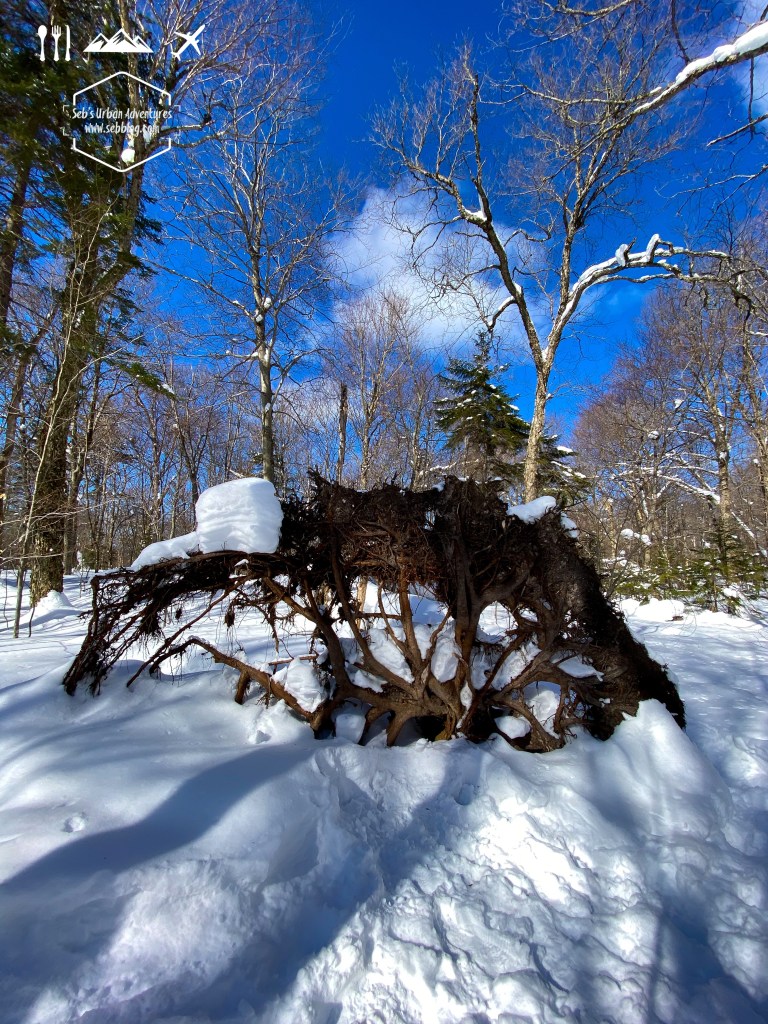The hike is moderate, but it starts right away with a climb that goes on for 3km where you’ll get all of your elevation gain. The view point right after that climb is awesome. Beware of the stairs they are really slippery, I kept my snowshoes and when besides them but everyone that took the stairs went down. The trail is also well marked and there are signs at every crossroads. The whole trail could have been done with spikes only but the La Coulée portion was not as hard pack, snowshoes really came handy.