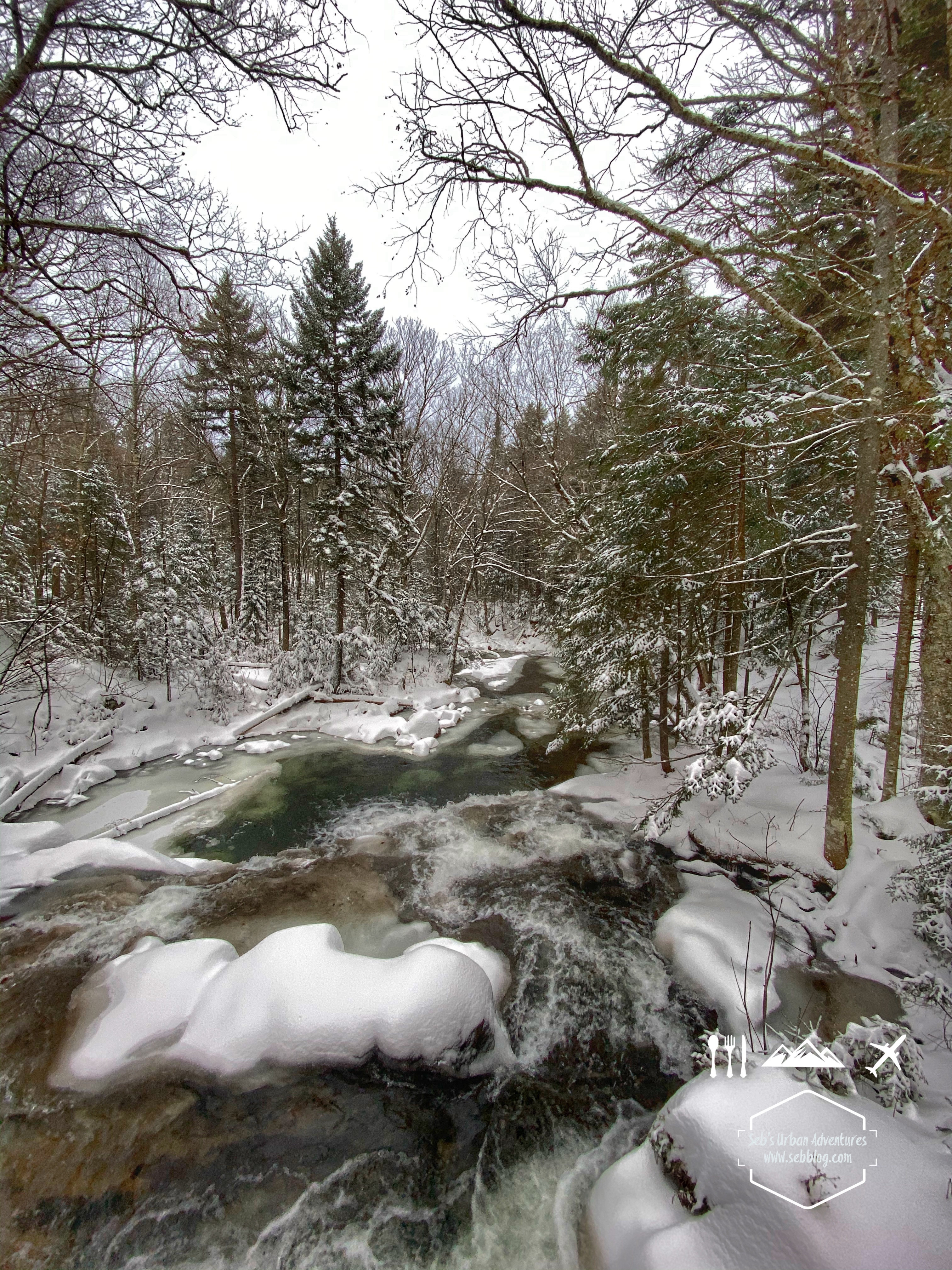Les sentiers sont bien indiqués et entretenus, nous ne nous sommes pas égarés une seule fois. J’ai opté pour des bottes d’hiver légères et des guêtres pour cette randonnée. Sachant que je serais dans une bonne quantité de neige toute la randonnée, je voulais m’assurer de garder mes pieds au chaud. J’ai également utilisé les bâtons de randonnée et les crampons de sentier. Si vous sentez qu’il y a moins de traction sur vos crampons, il y avait beaucoup de neige fondue le long du chemin et nous devions les nettoyer souvent pour garder une bonne traction.