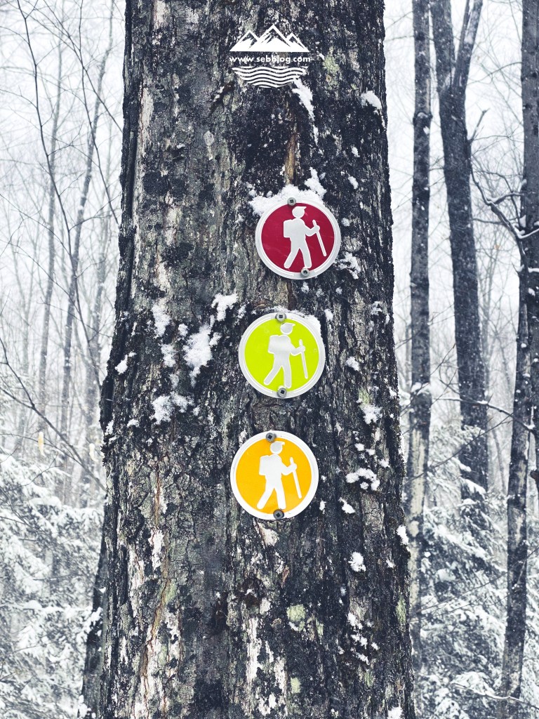 Les sentiers sont très bien indiqués par un système de couleurs et il y a des cartes à chaque carrefour et des balises à intervalles réguliers sur le sentier. Il faut suivre les indications du sentier car le Sentier de l’Estrie passe aussi par des parties du sentier jaune et rouge.