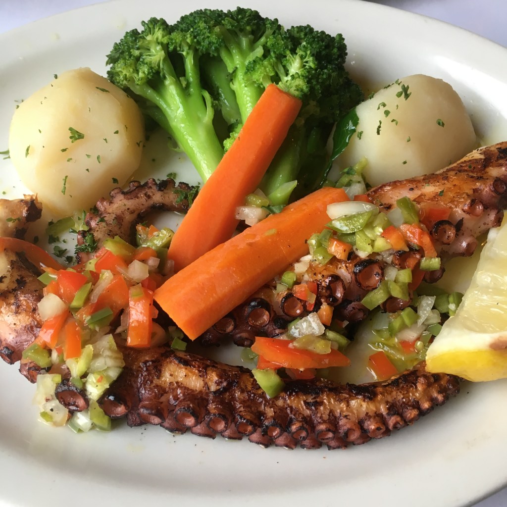 Lors de ma dernière visite, j’ai pris les grillades mixtes qui se composent d’agneau, de caille, de steak et de poulet. Servi avec des frites et une salade, ce plat était vraiment délicieux. Ils ont aussi les traditionnels Pasteis de Bacalhau ( des croquettes de morue) et je dois admettre que leur pieuvre grillée est aussi très tendre et extrêmement bonne.
