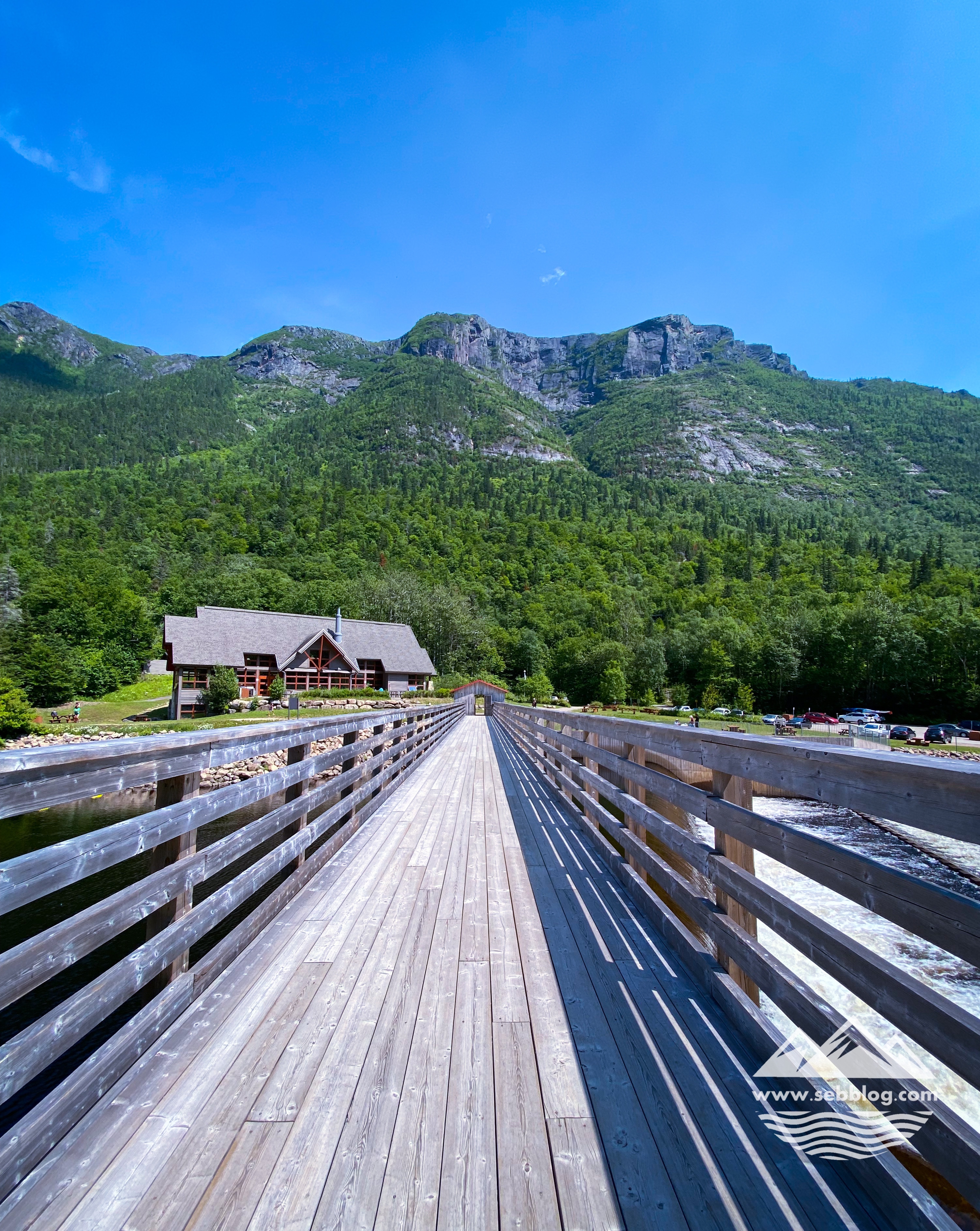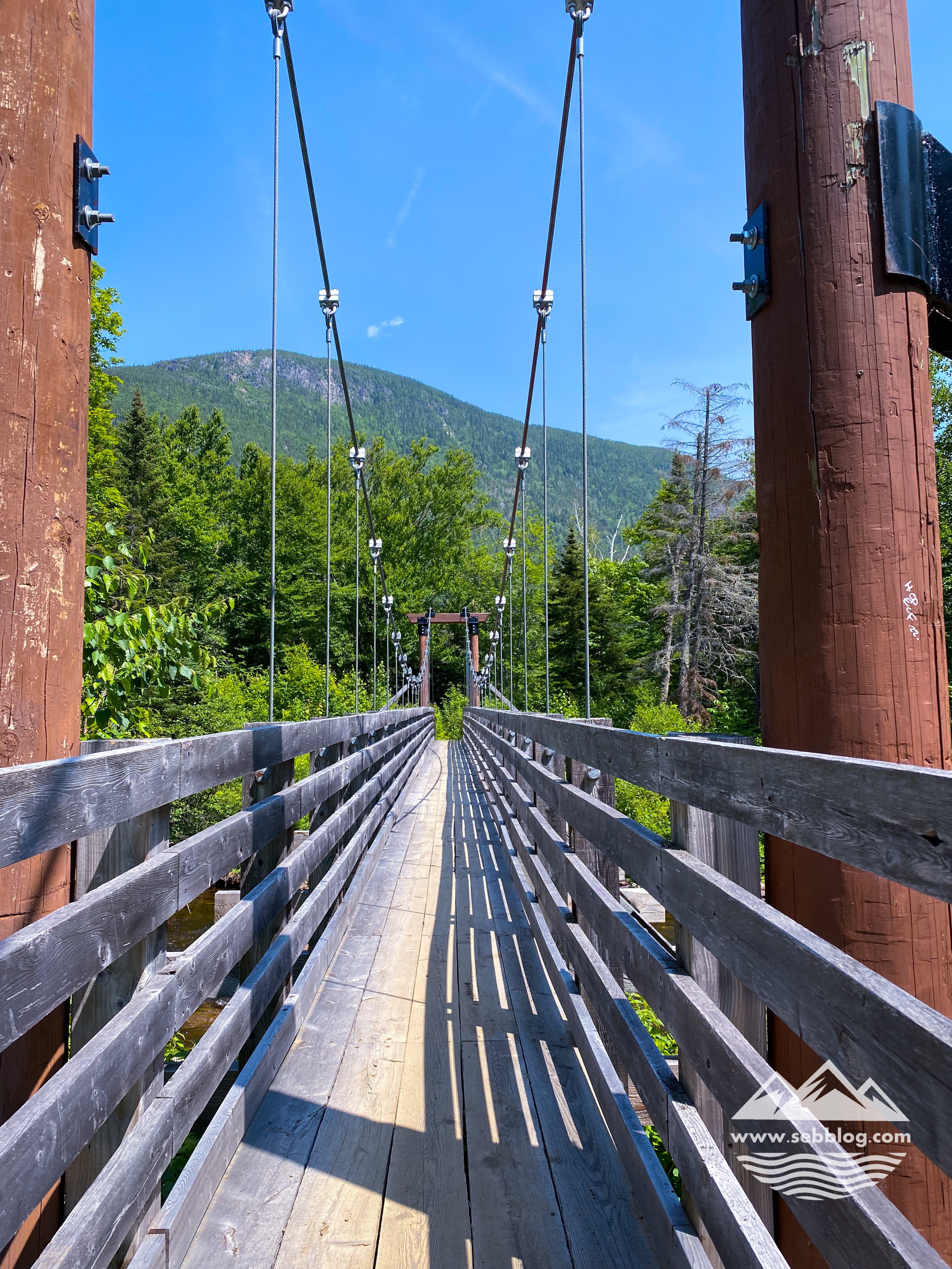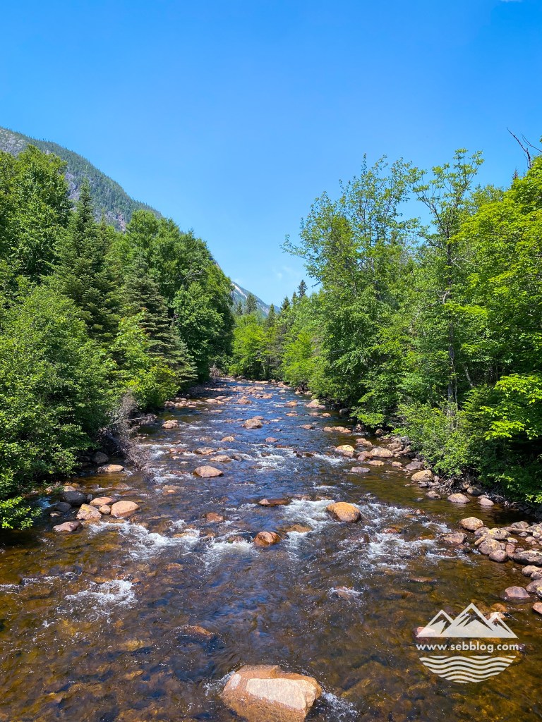 En plus de la vue sur la rivière Malbaie, vous avez également une vue sur l’Acropole des Draveurs depuis le bas et un pont suspendu sympa à traverser. C’est un pont bas pour traverser une partie de la rivière mais il a du ressort. La dernière partie du sentier est assez rocailleuse vers la fin, juste avant d’atteindre le pont pour traverser la rivière Malbaie jusqu’au centre de service Le Draveur.
